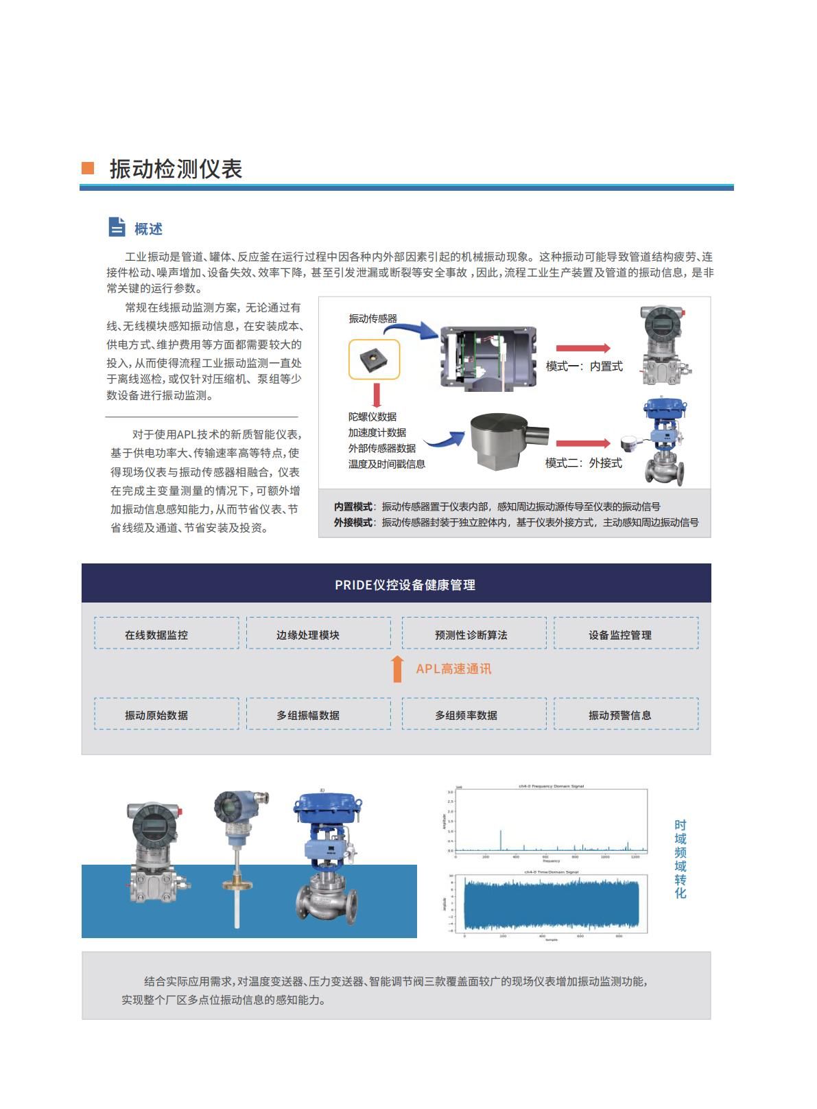 對于使用APL技術(shù)的新質(zhì)智能儀表,基于供電功率大、傳輸速率高等特點,使得現(xiàn)場儀表與振動傳感器相融合, 儀表在完成主變量測量的情況下,可額外增加振動信息感知能力,從而節(jié)省儀表、節(jié)省線纜及通道、節(jié)省安裝及投資。